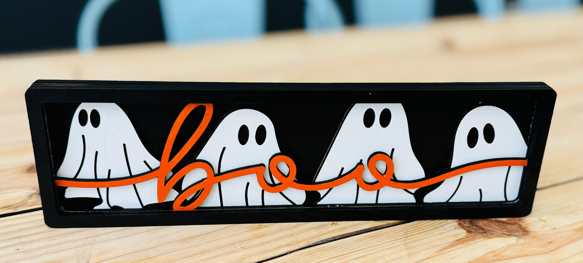 Boost your Halloween decor with our 3D BOO Halloween Shelf Sitter! Crafted with 3D details and featuring ghosts, this shelf sitter will add a spooky touch to any space. Perfect for adding a festive flair to your home or office.