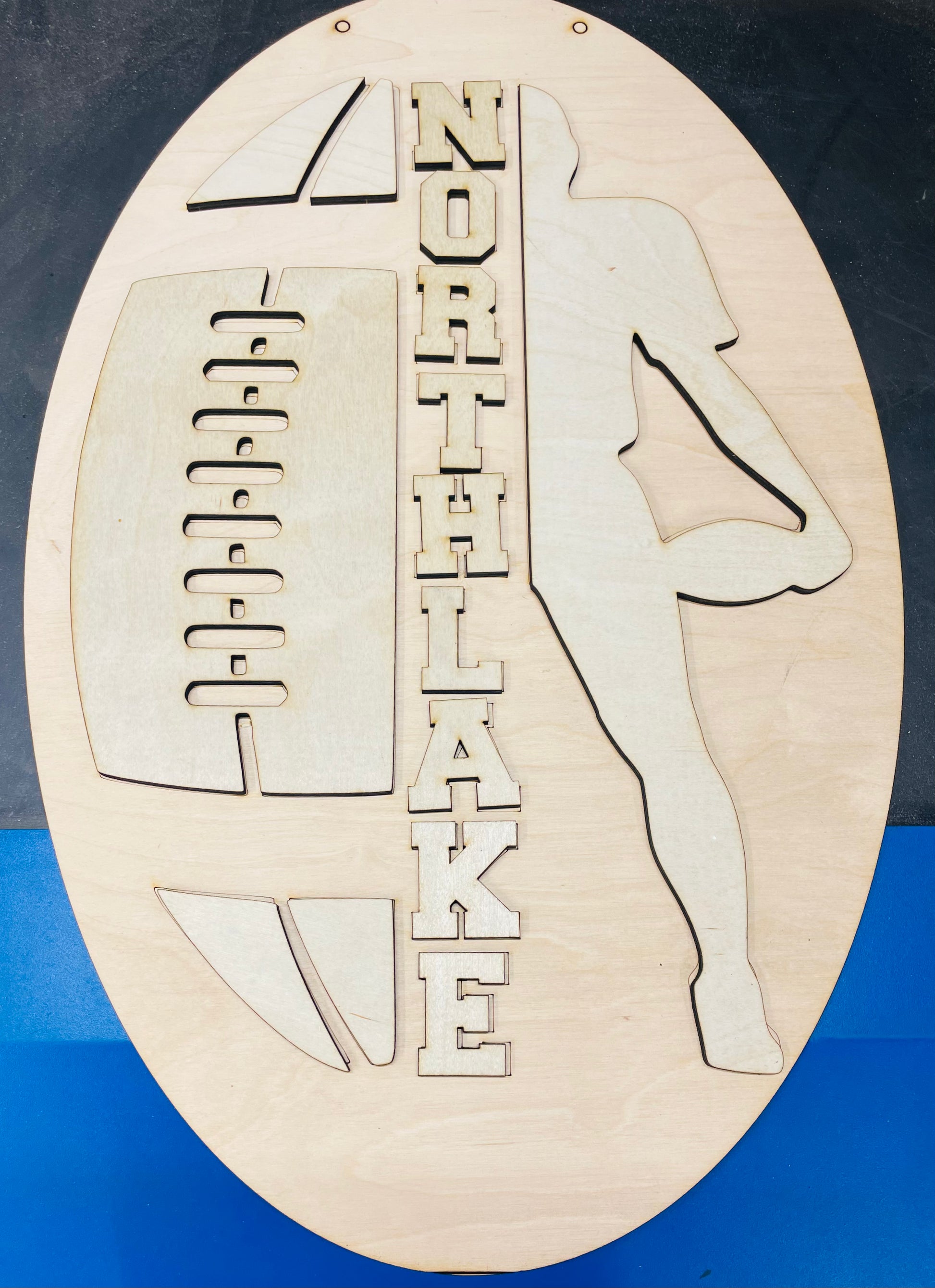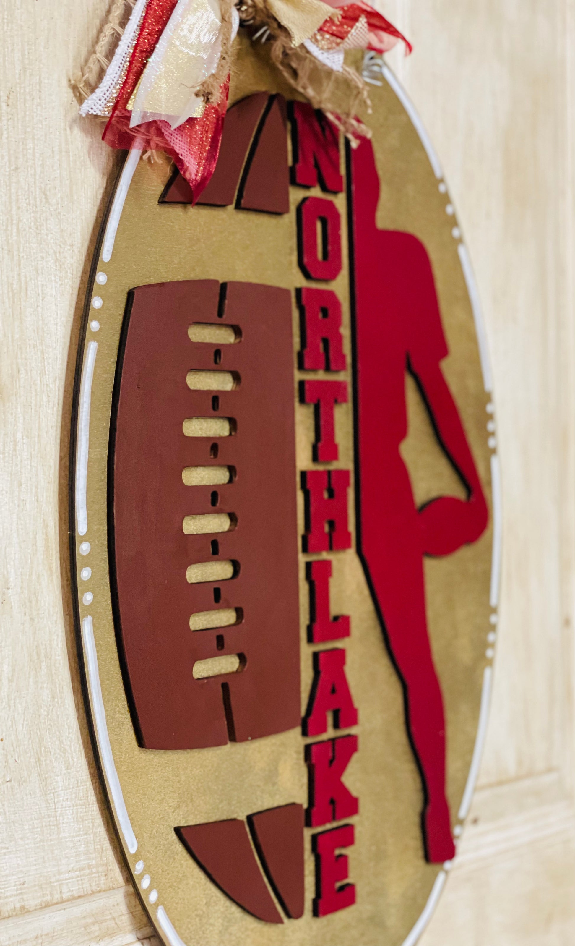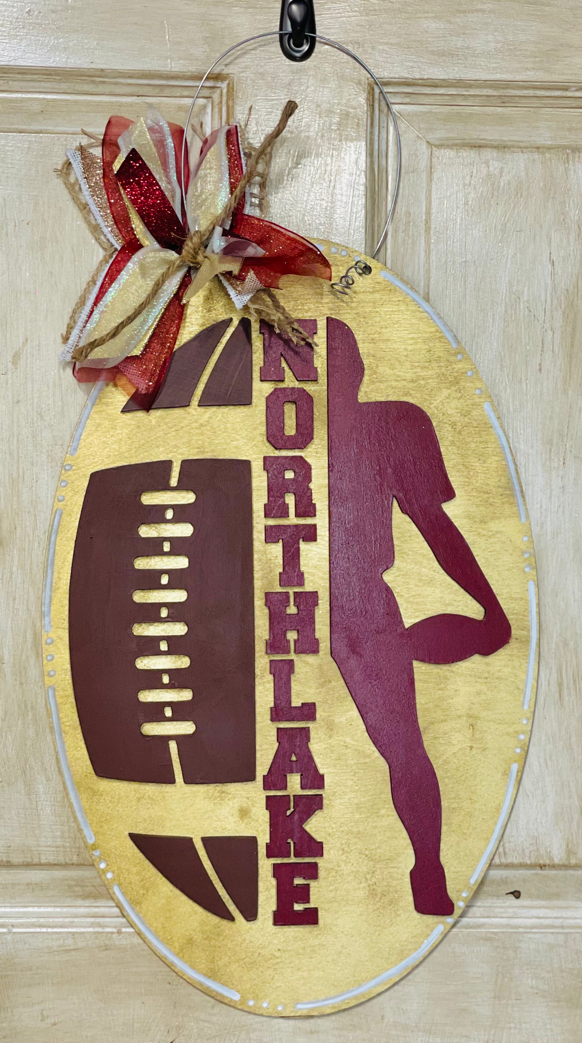 This custom to your school or sports organization half football/half player door hanger is just perfect to display your sport spirit!