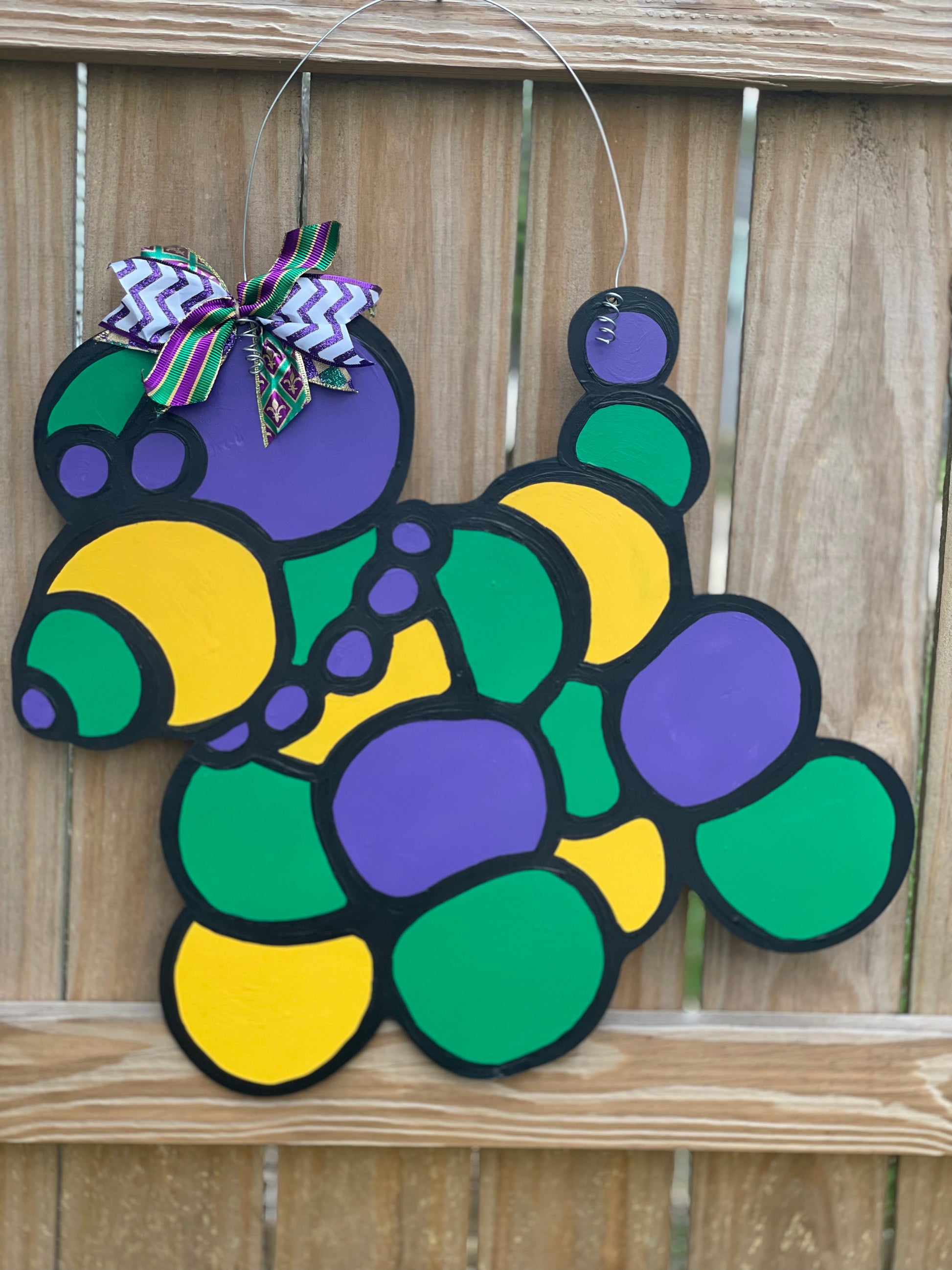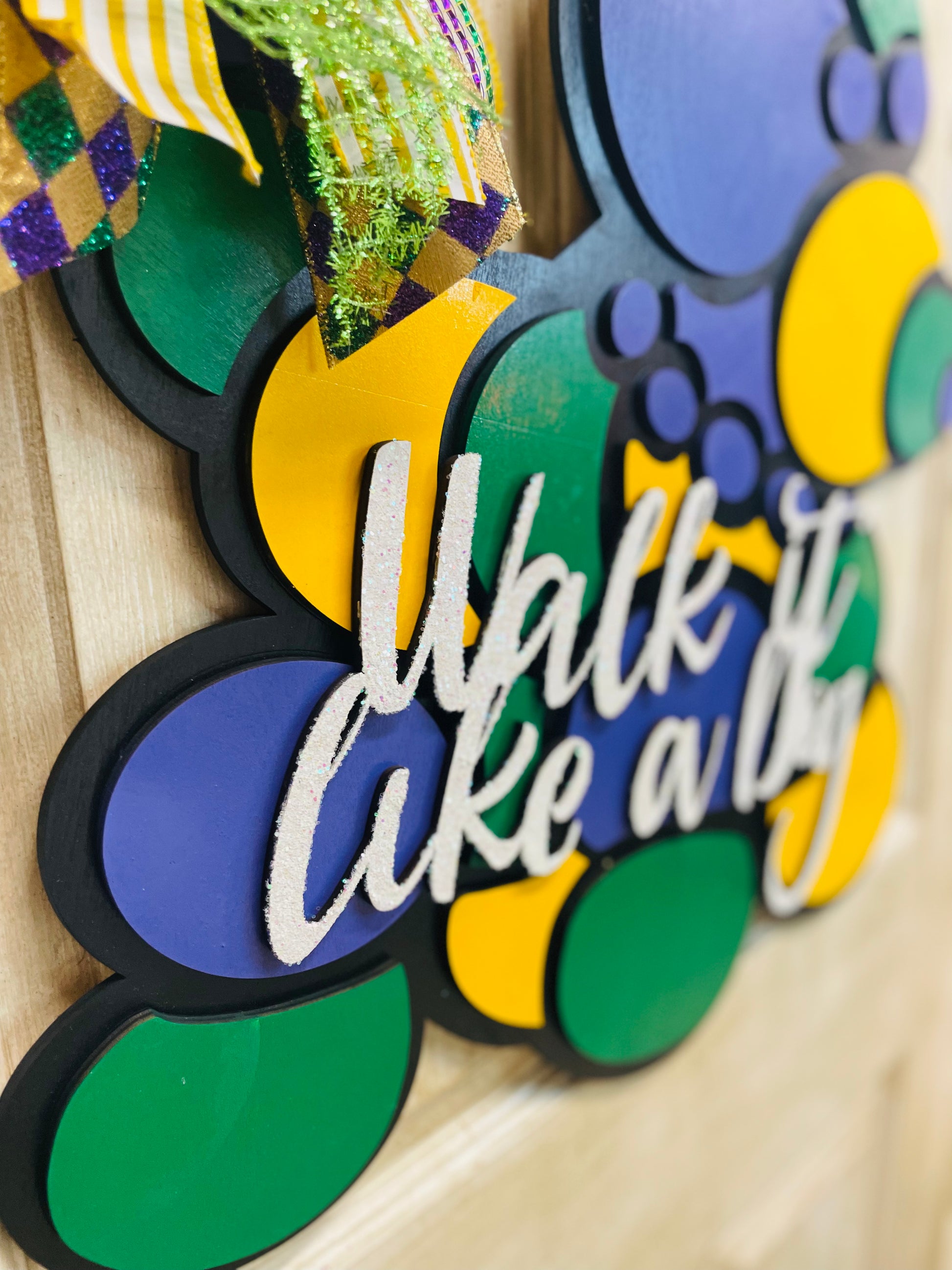 Welcome the party pup in style with this 3D Mardi Gras Bead Dog Door Sign! This beaded doggie décor features festive beads in all the Mardi Gras colors, making it the perfect way to show off your iconic New Orleans style. Plain or with "walk it like a dog" funny saying.