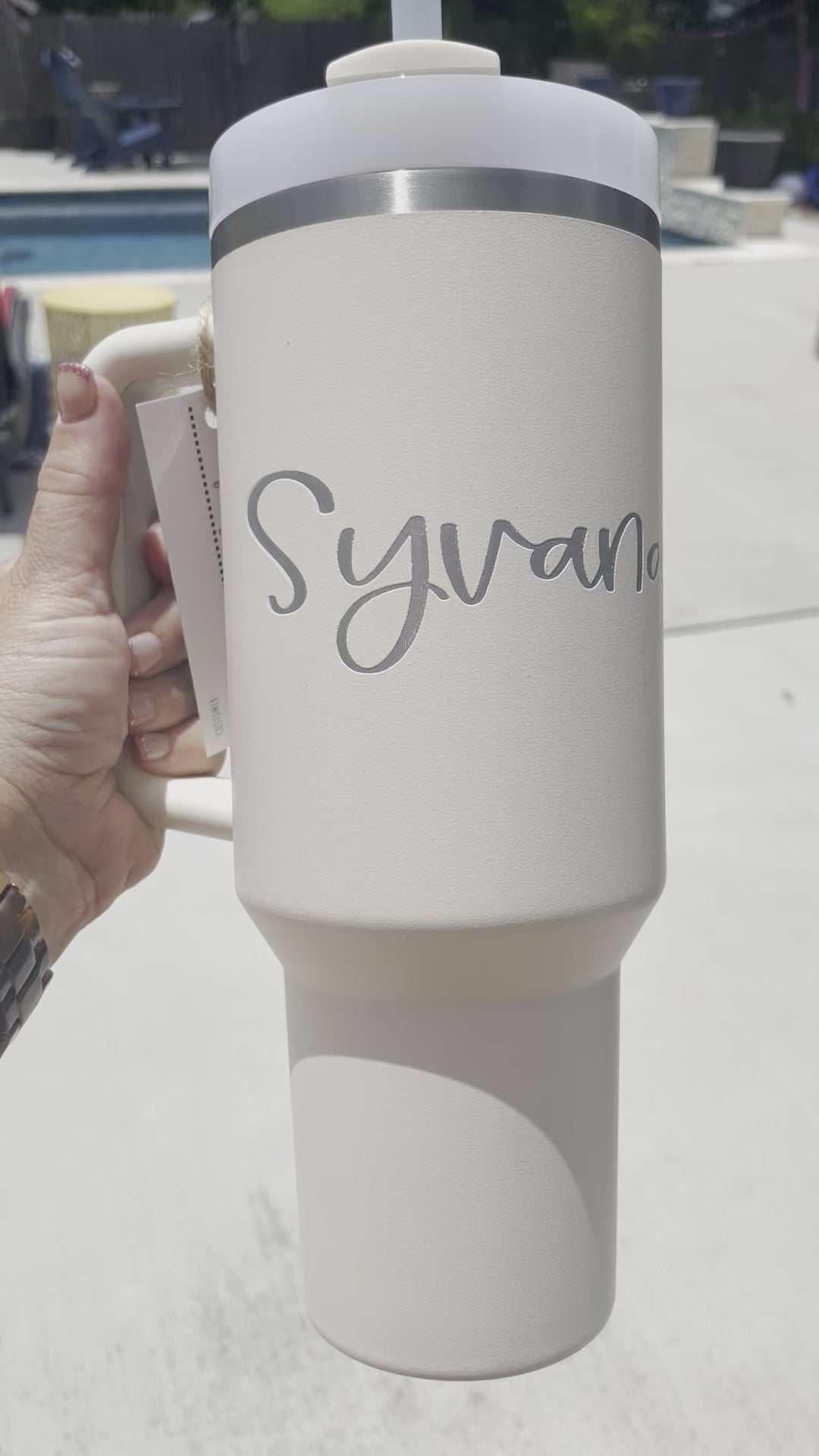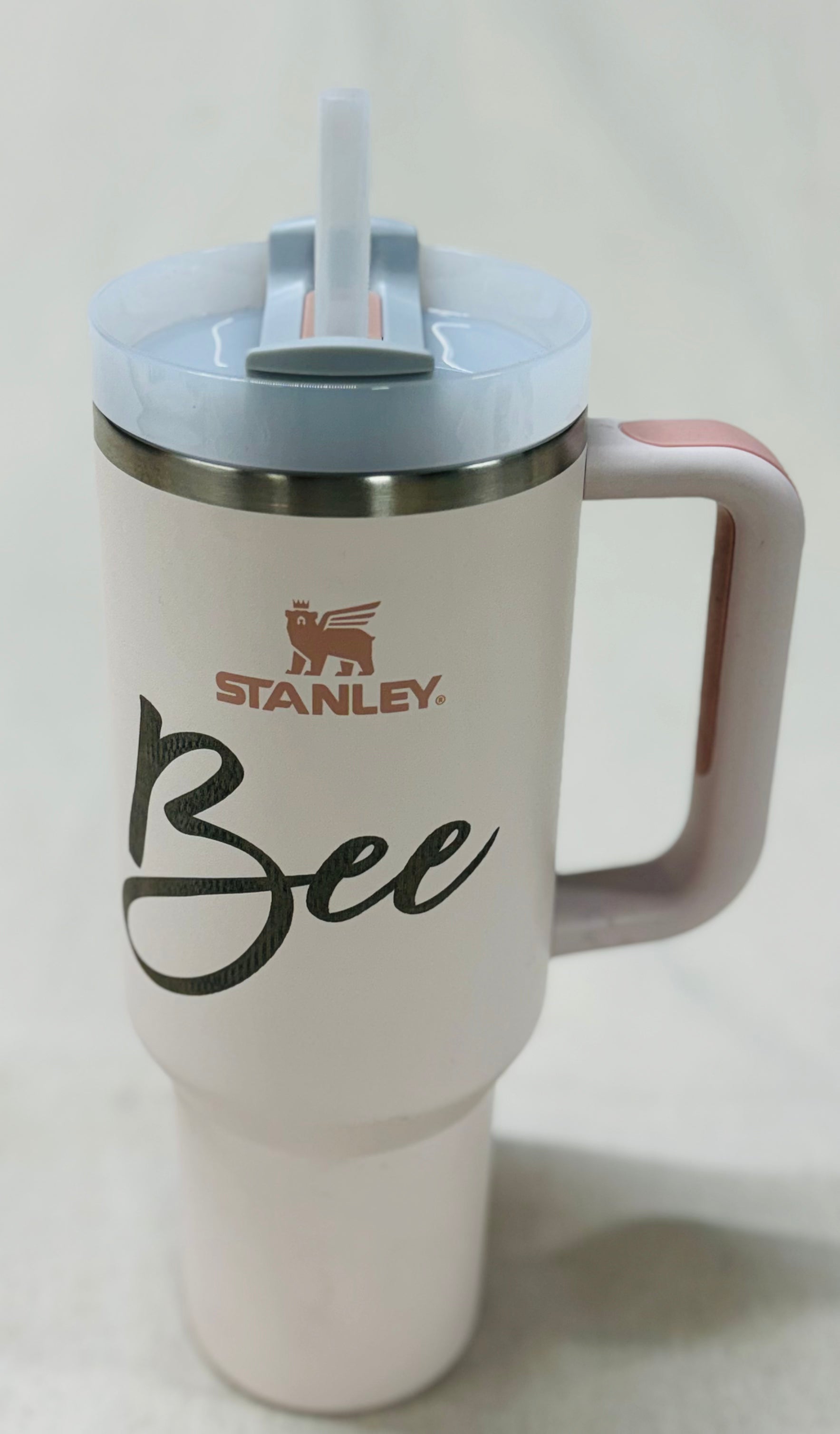 This Engraved Stanley cup is perfect for any occasion! Featuring a Stanley handled tumbler and an engraving of your choice, this cup is perfect for personalization. With a unique design, this cup is sure to stand out in any collection.