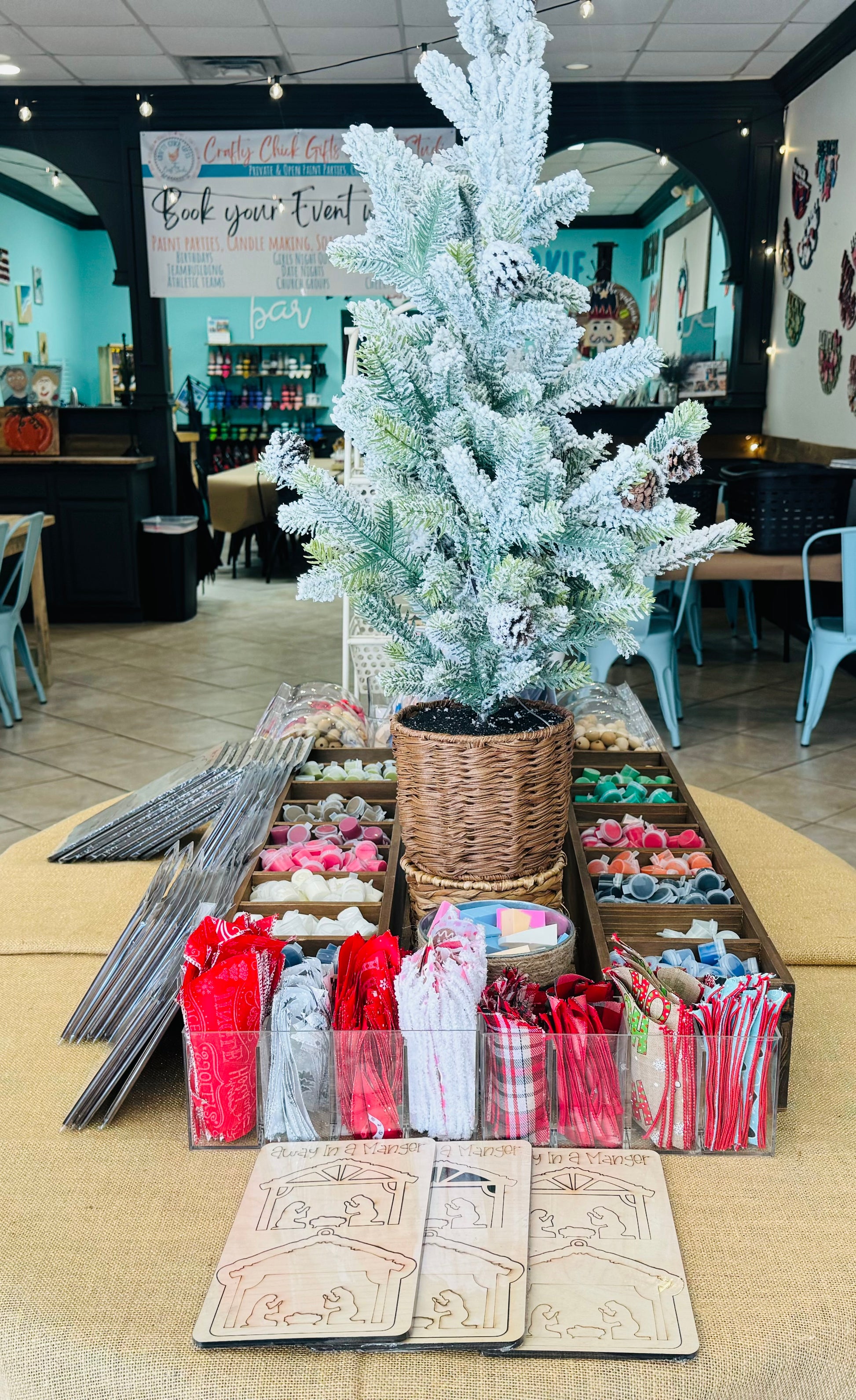 FOOD/DRINK: You are allowed to bring food, drinks, party products, cake, balloons and more! We also allow mommy/daddy drinks brought into our studio too. We recommend any eating/drinking and socializing, happen after the project is painted and drying/assembling by the Crafty Chicks.