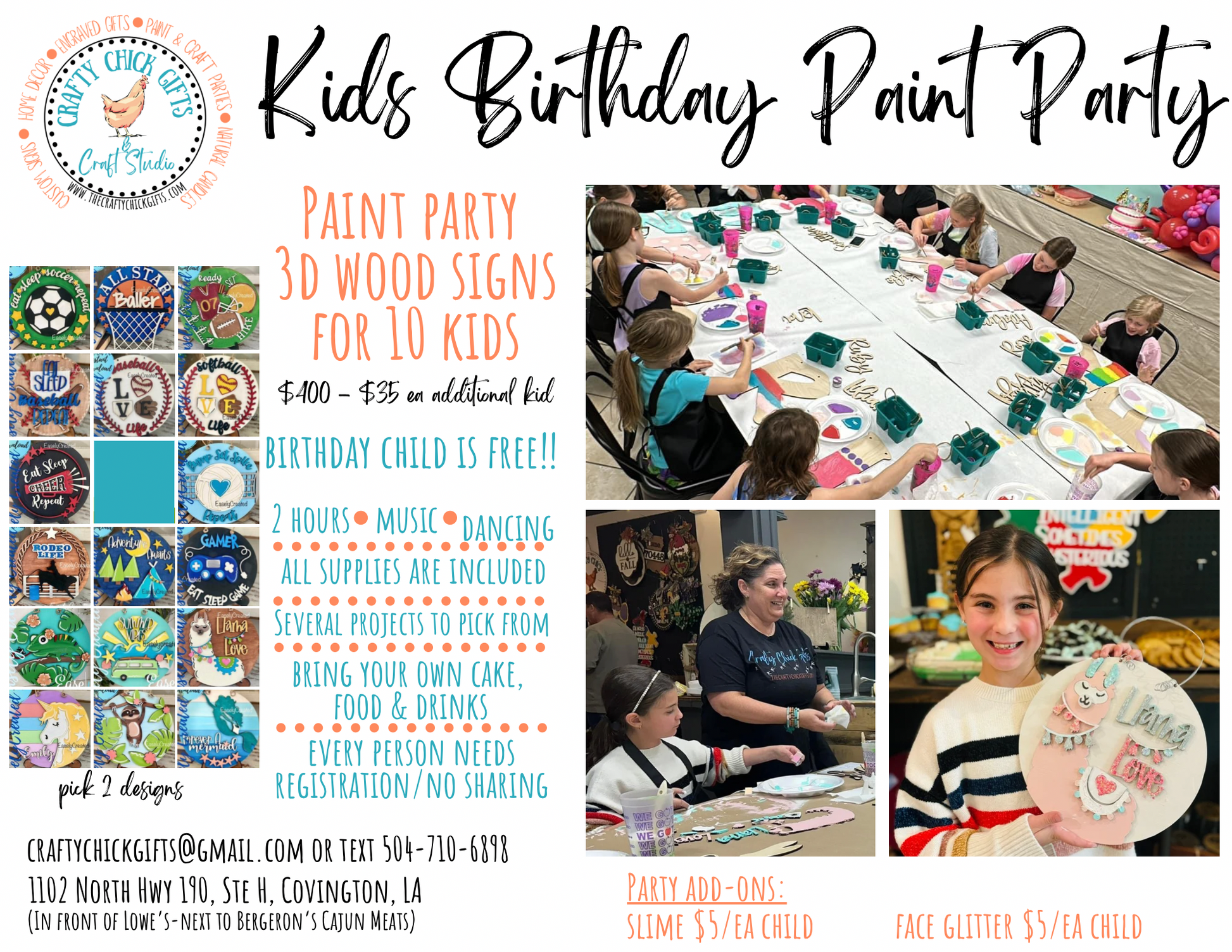 FOOD/DRINK: You are allowed to bring food, drinks, party products, cake, balloons and more! We also allow mommy/daddy drinks brought into our studio too. We recommend any eating/drinking and socializing, happen after the project is painted and drying/assembling by the Crafty Chicks.